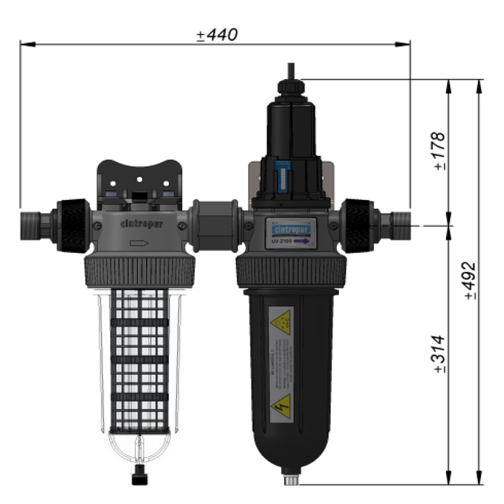 Filtervlies in 25 μm, 1 UV-C Lampe 25W, 1 Schlüssel, 1 EdelstahlWandhalterung + 1 PP Wandhalterung + 2 Anschlüsse ¾ Zoll + 2 Anschlüsse 1 Zoll