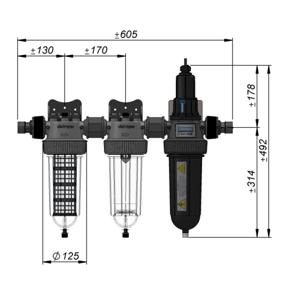 Filtervlies in 25 μm, mit Aktivkohle befüllte CTN-Kartusche, 1 UV-C Lampe 40W, 1 Schlüssel, 2 WandhalterungenPP + 30% GF + 1 Edelstahl Wandhalterung+ 2 Anschlüsse ¾ Zoll + 2 Anschlüsse 1 Zoll